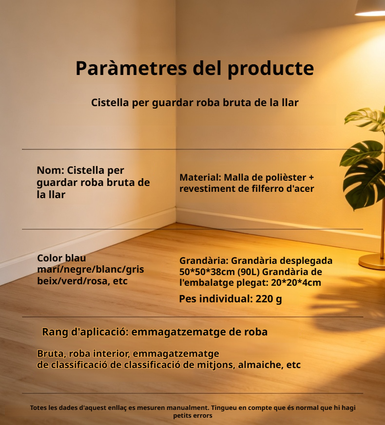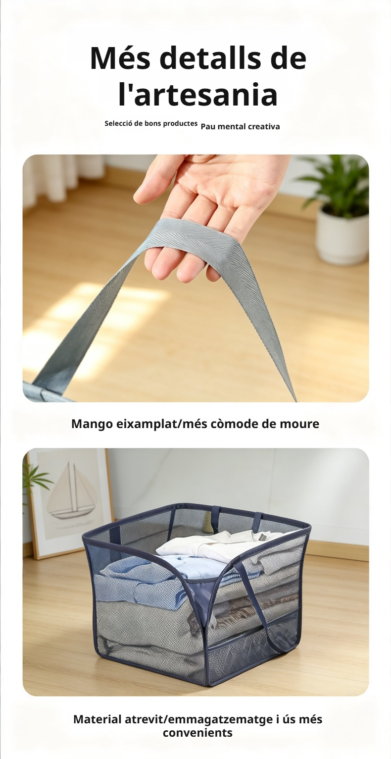 ● Gran capacitat de 90L, ideal per emmagatzemar tota la roba bruta de la família sense necessitat de buidar-la sovint. ● Disseny plegable que permet estalviar espai quan no s’utilitza, facilitant l’emmagatzematge i la portabilitat a qualsevol racó de la llar. ● Fabricada amb materials resistents i duradors que garanteixen una llarga vida útil i una gran estabilitat, fins i tot amb càrregues pesades. ● Inclou nanses reforçades per facilitar el transport de la roba bruta fins a la rentadora sense esforços ni incomoditats. ● Estil modern i elegant que s’adapta fàcilment a qualsevol decoració, aportant un toc d’ordre i funcionalitat a la teva llar.